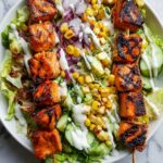 Remove the chicken from the skewers if preferred and arrange it on top of the prepared salad. Drizzle with ranch or BBQ ranch dressing for a creamy finish that complements the tangy and smoky notes of the BBQ chicken. Serve immediately for the freshest, most vibrant taste.