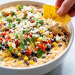 This vibrant Black Bean Corn Mexican Fiesta Dip is a quick and delicious party favorite that combines creamy avocado, zesty lime, and a medley of fresh vegetables with tangy feta and a spicy salsa-mayo sauce. Perfect for serving with chips or as a colorful addition to any Mexican-inspired gathering.