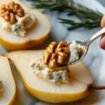 4. Stuff Pears: Spoon the blue cheese and honey mixture into the center cavity of each pear half, filling them generously.