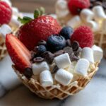 Place your waffle cones upright and start layering in the fun stuff. Begin with a spoonful of mini marshmallows, then add chocolate chips, peanut butter chips if you’re using them, candy pieces, and chopped nuts. Fill the cones almost to the top to get that gooey, full-flavored experience with every bite. This layering is what makes this Campfire Cones Recipe so indulgent and irresistible.