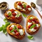 5. Layer Toppings: Arrange slices of fresh mozzarella on top of the pesto, followed by thin slices of tomato. Season with salt and pepper to enhance the flavors.