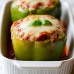 This Cheesy Baked Chicken Stuffed Peppers recipe features tender green bell peppers filled with a savory mixture of ground chicken, rice, onions, and garlic, all topped with melted mozzarella cheese and baked to perfection. A comforting and wholesome meal that’s easy to prepare and perfect for a family dinner.