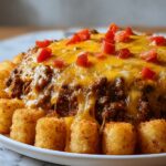 Grease a 9×13-inch baking dish and transfer the beef mixture evenly across the bottom. Next, carefully arrange a single layer of tater tots on top. The tots add a crispy, golden crunchy contrast to the creamy beef mixture beneath, making every bite exciting.