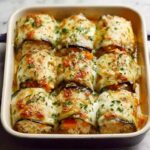 Delicious eggplant rolls stuffed with a flavorful blend of ricotta, mozzarella, and Parmesan cheeses, seasoned with herbs and baked in marinara sauce. This recipe offers a satisfying vegetarian appetizer or main dish with tender roasted eggplant wrapped around creamy cheese filling.