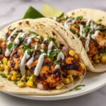 Fiery Street Corn Chicken Tacos feature tender marinated chicken thighs grilled to perfection and topped with a smoky, spicy street corn salsa. Combined with a creamy jalapeño cashew sauce, fresh avocado, and vibrant cilantro, these tacos bring bold, layered flavors inspired by vibrant street food. Perfect for a flavorful weeknight dinner or casual entertaining, they deliver a delightful blend of smoky, spicy, and creamy elements wrapped in warm corn tortillas.
