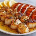 Plate the garlic butter lobster tails alongside the seared scallops. Drizzle any remaining garlic butter from the skillet over the top, sprinkle with fresh parsley, and arrange lemon wedges on the side. This final touch ties the dish together visually and flavor-wise, inviting everyone to dive into a beautifully balanced seafood feast.