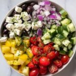 - Combine the vegetables: In a medium mixing bowl, combine the diced tomatoes, chopped red onion, diced cucumber, and chopped Kalamata olives.