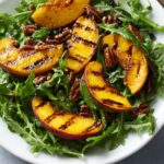 A fresh and vibrant grilled peach salad featuring tender, caramelized peaches, juicy blueberries, candied curry pecans, and creamy goat cheese, all tossed in a sweet and tangy honey vinaigrette. This salad combines smoky grilled fruit with crunchy spiced nuts and peppery arugula for a perfect summer dish.