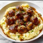 Return the browned meatballs to the skillet, spoon the luscious gravy generously over them, and let them simmer together for an additional 5 minutes. This step melts all the flavors into one another, making the dish truly irresistible. Then, spoon the meatballs and gravy over your warm mashed potatoes and get ready to serve pure comfort on a plate.