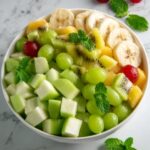 A refreshing and vibrant Leprechaun Fruit Salad featuring a delightful combination of green grapes, kiwi, green apple, and honeydew melon, lightly tossed with lime juice and garnished with fresh mint leaves. This quick and easy-to-make fruit salad is perfect for a healthy snack or a festive St. Patrick’s Day treat.