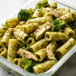 Store any leftover One Pan Creamy Pesto Chicken & Broccoli Pasta Recipe in an airtight container in the refrigerator for up to 3 days. It keeps well, retaining its creamy texture and vibrant flavors.