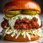 This Pickle Brined Fried Chicken Sandwich features juicy, tender chicken thighs marinated in dill pickle brine and hot sauce for a flavorful punch. The chicken is double-dredged in a seasoned flour and cornstarch mixture for an ultra-crispy coating, then deep-fried to golden perfection. Served on toasted brioche or potato buns with a tangy Dijon mayo, shredded lettuce or slaw, and crunchy dill pickles, this sandwich delivers a perfect balance of bold, tangy, and savory flavors in every bite.