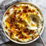 Now the real fun begins! Stir in the chopped crispy bacon, ranch dressing, shredded cheddar cheese, and chopped chives. The cheese will melt into the warm potatoes, creating a gooey, cheesy pull with every spoonful, and the toppings unite to elevate each bite.