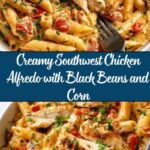 This Southwest Chicken Alfredo combines tender, spiced chicken breasts with a creamy homemade Alfredo sauce, tossed with fettuccine pasta, sweet corn, black beans, and optional diced tomatoes. Finished with fresh cilantro, this dish offers a flavorful twist on classic Alfredo with a southwestern flair, perfect for a hearty and satisfying dinner.