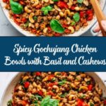 This Sweet and Spicy Gochujang Chicken Bowls recipe offers a vibrant and flavorful meal with tender ground chicken cooked in a rich, spicy-sweet gochujang sauce accented by toasted sesame oil, fresh basil, and crunchy cashews. Perfect for a quick weeknight dinner, the dish is served over steamed rice and garnished with scallions and sesame seeds for added texture and freshness.