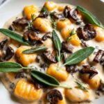 Serving your Sweet Potato Gnocchi with Creamy Mushrooms and Crispy Sage Recipe in shallow bowls or rustic plates frames the saucy gnocchi beautifully. For a touch of elegance, top with microgreens or edible flowers to brighten the presentation. You might also serve individual portions in small cast-iron pans right from the stove to the table for that charming, cozy vibe.