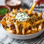 Take the fries out of the oven and add finishing touches. Dollop sour cream across the top, scatter chopped green onions, and if you’re feeling adventurous, add jalapeño slices to introduce a spicy crunch. These toppings balance flavors and add fresh bursts of texture.